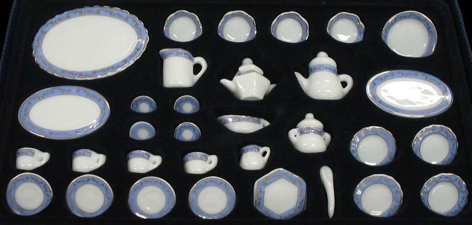 Box of 5 Sets of Ceramic Dinner Set, Blue Trim, 35 Pieces (Felt Tray and Box with Plastic Top)