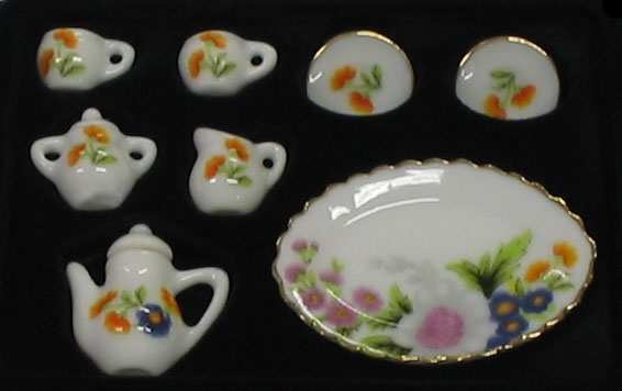 Ceramic Tea Set, White with Blue/Pink/Orange Floral, 10 Pieces