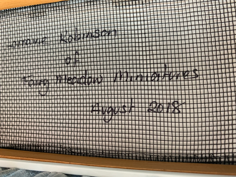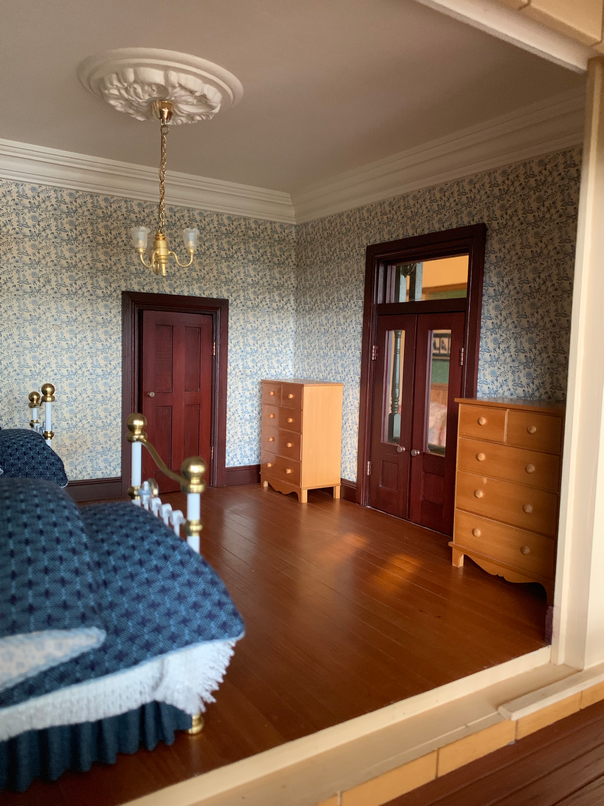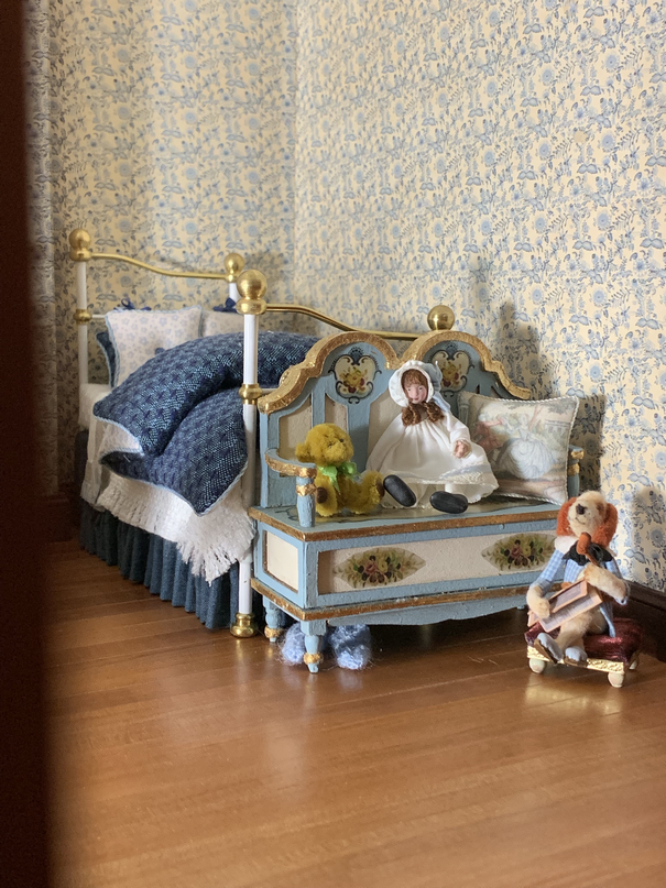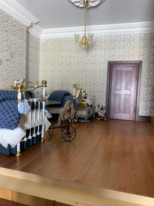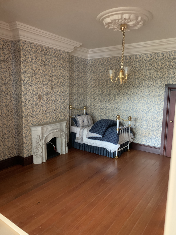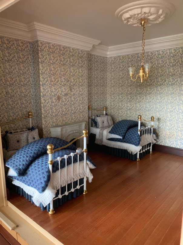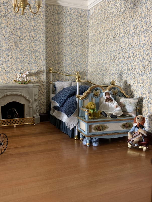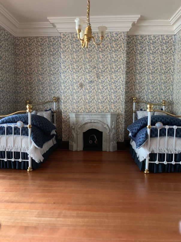 So here are some pictures of the first room that I am going to furnish. This is going to be the girls room. There will be two girls, mainly becaue I loved the idea of having single beds either side of the fireplace and about a year ago I made two twin beds with this room in mind. Here is proof that I did indeed make the beds a year ago. I always sign my beds underneath.....who said I worked fast...lol