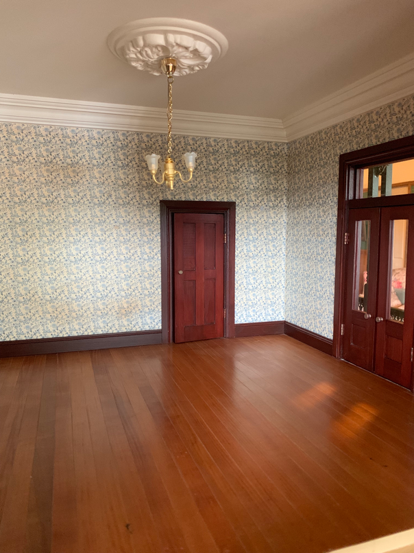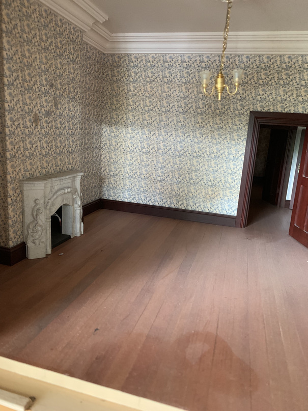 Now to show you how much dust has accumulated. I can see that the wallpaper has some marks on it over the fireplace. The original owner must have used bluetack to put up pictures. It wont matter because I aim to put a large picture up there to cover the marks.