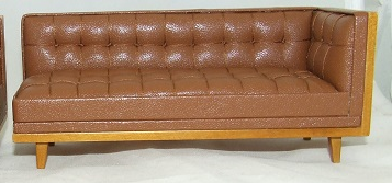 Mid Century Sectional Measures 6 inches long X 2 3/8 inches wide x 2 1/2 inches high and is available upholstered in a tufted brown leather fabric. The timber frame has a light walnut finish