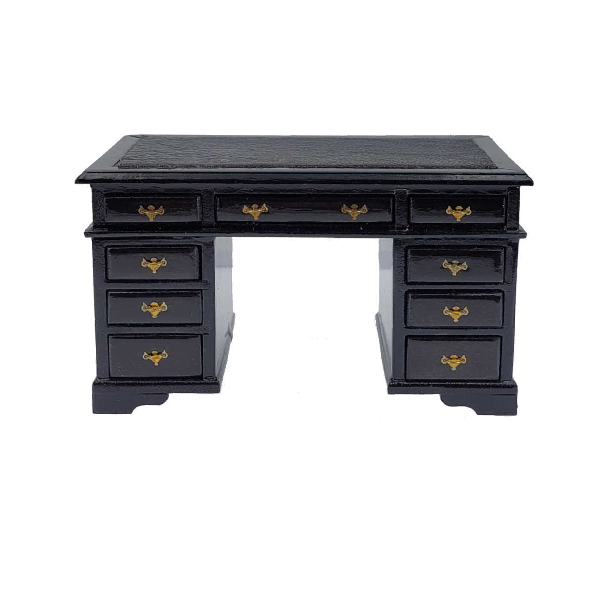 The furniture kit (of natural wood) includes a genuine leather inset for the table top. The drawers can all be opened.
